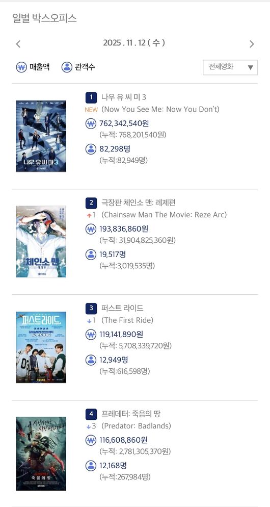 '나우 유 씨 미 3'는 '프레데터: 죽음의 땅', '극장판 체인소 맨: 레제편', '퍼스트 라이드'를 모두 제치고 전체 영화 박스오피스 1위에 등극하는 기염을 토했다. 특히 영화 '나우 유 씨 미 3'의 압도적인 오프닝 스코어는 2025년 흥행 3위 의 오프닝 스코어인 82,917명을 잇는 기록으로 하반기 '나우 유 씨 미 3'가 본격적으로 극장가에 불러 일으킬 흥행 매직에도 귀추가 주목된다.
