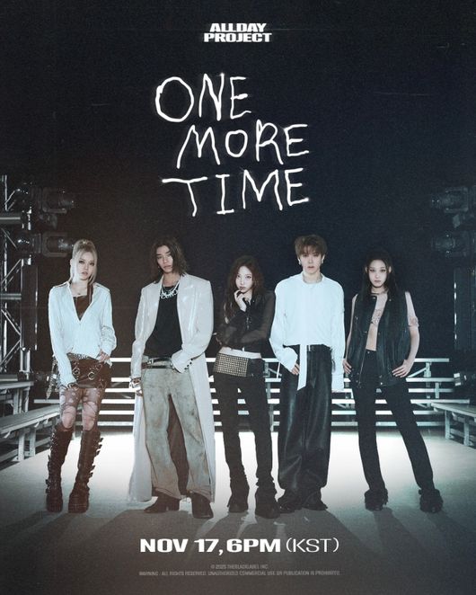 더블랙레이블은 12일 공식 SNS를 통해 그룹 ALLDAY PROJECT(올데이 프로젝트, 애니·타잔·베일리·영서·우찬)가 11월 17일 발표하는 새 디지털 싱글 'ONE MORE TIME'(원모어타임)의 포스터를 공개했다.
