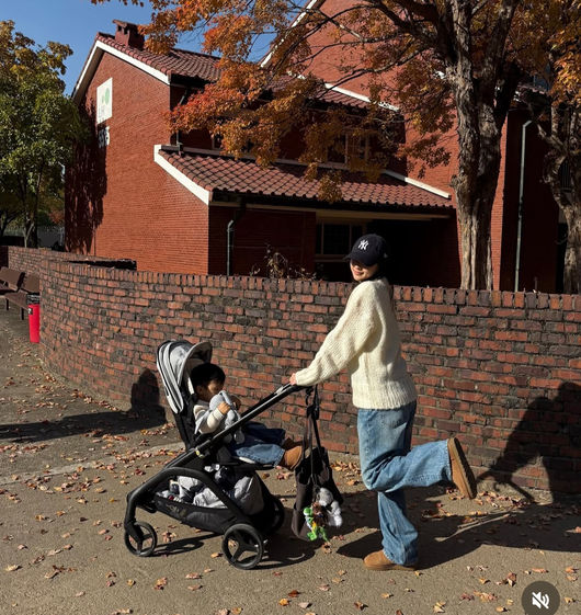 이날 손연재는 아들을 태운 유아차를 끌며 깜찍한 자세를 취했다. 손연재를 똑닮은 아들은 엄마와 커플룩을 입고 있었는데, 이들 모자는 흰색 양털이 특징인 아우터에 통이 큰 청바지, 그리고 갈색 어그를 신어 귀여운 느낌을 자아냈다. 다사로운 가을볕이 카메라 가득 담긴 것도 인상적이었다.