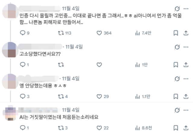 이에 대해 누리꾼들이 “고소당했다면서요?”라고 묻자 A씨는 “안 당했는데요”라며 소속사 주장과 상반된 답변을 내놓았다. 이후 소속사의 공식 고소 발표 기사까지 확인한 A씨는 “AI는 거짓말이었다는 건 처음 듣는 소리”라며 이전의 ‘장난이었다’는 사과문까지 뒤집는 발언을 이어갔다.