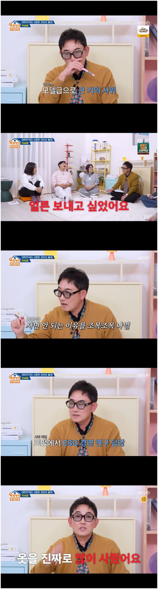 그는 “난 사실 사위 조건으로 군대 다녀오고, 술을 마실 줄 알아야 한다고 했다. 그런데 사위는 술을 못 마시는 게 아니라 나보다 주량이 엄청나더라. 그런데 본인이 안 마신 거더라. 그게 너무 마음에 들어서 만난 지 6개월 만에 결혼을 허락했다”라며 “그리고 사위 키가 188cm다. 주우재만 하다. 내 딸도 팔다리가 길쭉길쭉하다. 그래서 얘들의 2세를 기대한다”라면서 사위의 신체 조건까지 만족한다고 밝혔다.