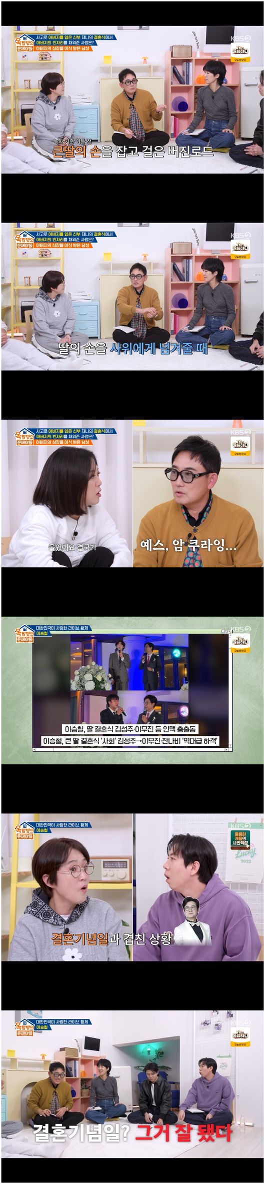 그러나 딸의 결혼은 오히려 독려했다는 이승철. 이유는 바로 사위가 너무나 훌륭한 청년이었고, 보기 드문 신랑감이었다는 것. 이승철은 "연애한 지 1년밖에 안 됐는데 얘다, 싶었다. 사위는 정말 검소하다. 신발이 세 켤레뿐에, 새벽 5시에 늘 출근해서 자기 일을 준비하더라. 거기에 술, 담배도 안 한다”라고 말했다.