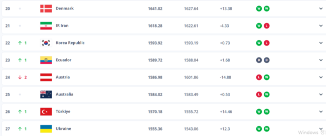 한국(1593.19점)이 북중미월드컵에서 포트2 배정을 받기 위해서는 FIFA 랭킹 23위 이상을 유지해야 했다. 천만다행히도 10월 A매치서 오스트리아가 산마리노를 10-0으로 잡았으나 루마니아에 0-1로 패배하면서 순위가 급등했다.