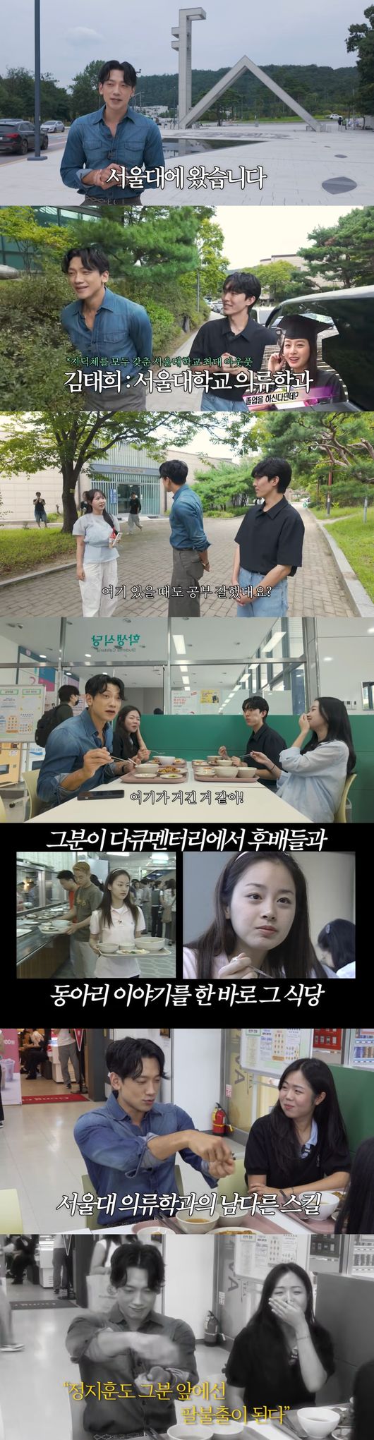 이후 비는 학생들과 학생 식당으로 이동해 밥을 먹던 도중 "나 왠지 여기 본 것 같다"며 기억을 더듬었다. 알고보니 이곳이 김태희 다큐멘터리에 나왔던 곳으로, 비는 당시 김태희가 친구들과 나누던 대화까지 정확히 기억해 눈길을 끌었다.
