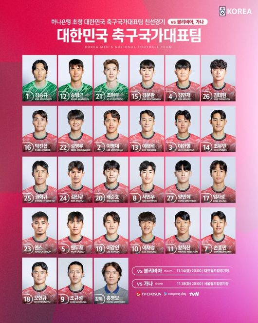 대한축구협회는 13일 공식 소셜 미디어를 통해 축구 11월 A매치에 소집된 대표팀 선수단 26명의 등번호를 공개했다. 14일 오후 8시 대전월드컵경기장에서 열리는 볼리비아전과 18일 오후 8시 서울월드컵경기장에서 열리는 가나전에서 사용할 번호다.