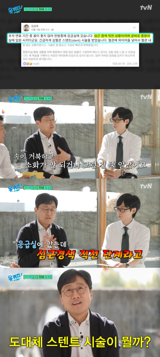 그렇다면 스텐트 시술 이후 몸 상태는 어떨까. 김 교수는 “중환자실에 누워있는데 ‘도대체 스텐트 시술이 뭘까?’”라는 생각을 했다고 밝혔고, 유재석은 “그게 제일 궁금하셨냐”며 당황하는 모습을 보였다.