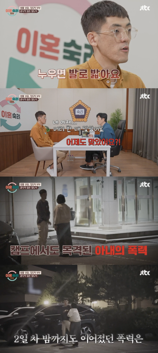 더 큰 충격은 폭행이 상담 캠프 촬영 중에도 계속됐다는 점이었다. 남편은 “캠프에서도 맞았냐”는 질문에 “어제도 맞았다. 머리를 한 대 맞았다”고 담담히 밝혔다. 실제로 관찰 카메라에는 캠프 마지막 날까지 남편이 폭행을 당하는 장면이 포착돼, 폭력이 단발적이 아닌 상습적이라는 사실이 드러났다.