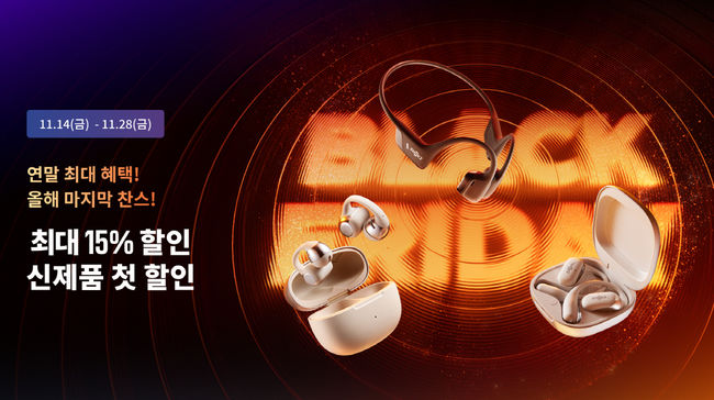 글로벌 오픈형 이어폰 브랜드 샥즈(SHOKZ)가 연중 최대 쇼핑 혜택을 제공하는 ‘샥즈 블랙프라이데이’ 프로모션을 11월 28일까지 실시한다.