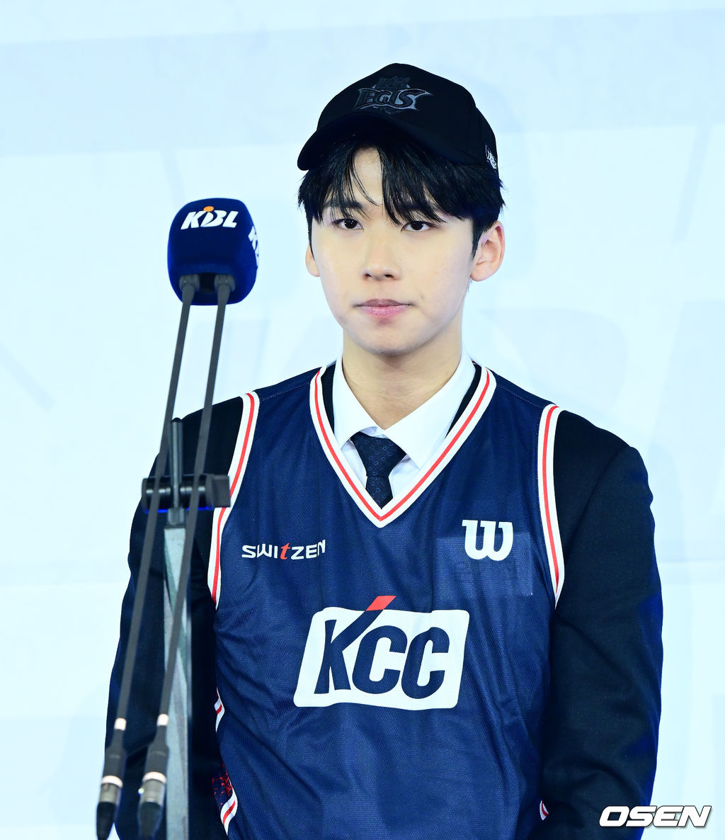 고려대 윤기찬이 1라운드 3순위로 KCC에 지명되며 인사를 하고 있다. 2025.11.14 /jpnews@osen.co.kr