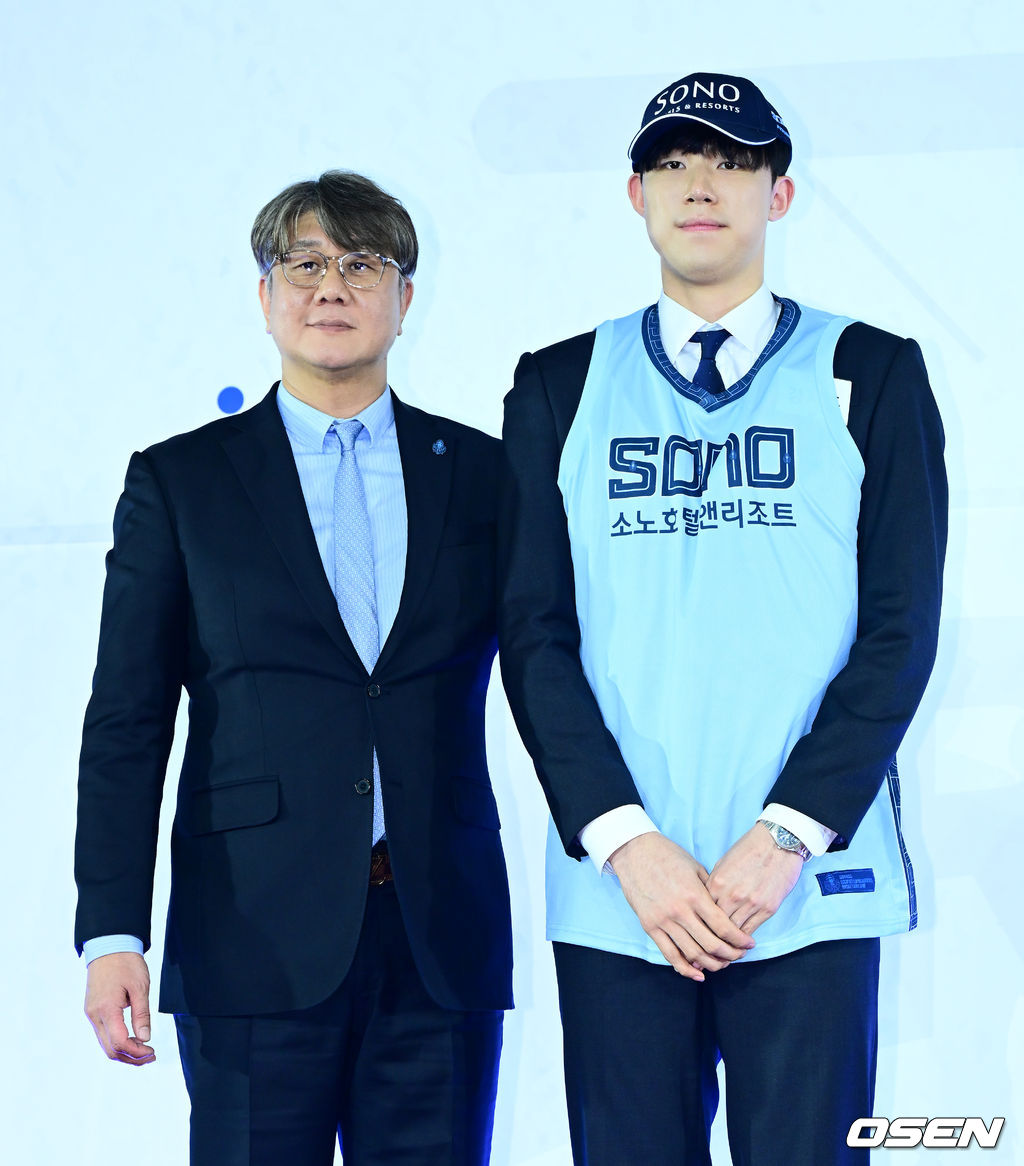 연세대 강지훈이 1라운드 4순위로 고양 소노에 지명되며 손창환 감독과 기념 촬영을 하고 있다. 2025.11.14 /jpnews@osen.co.kr