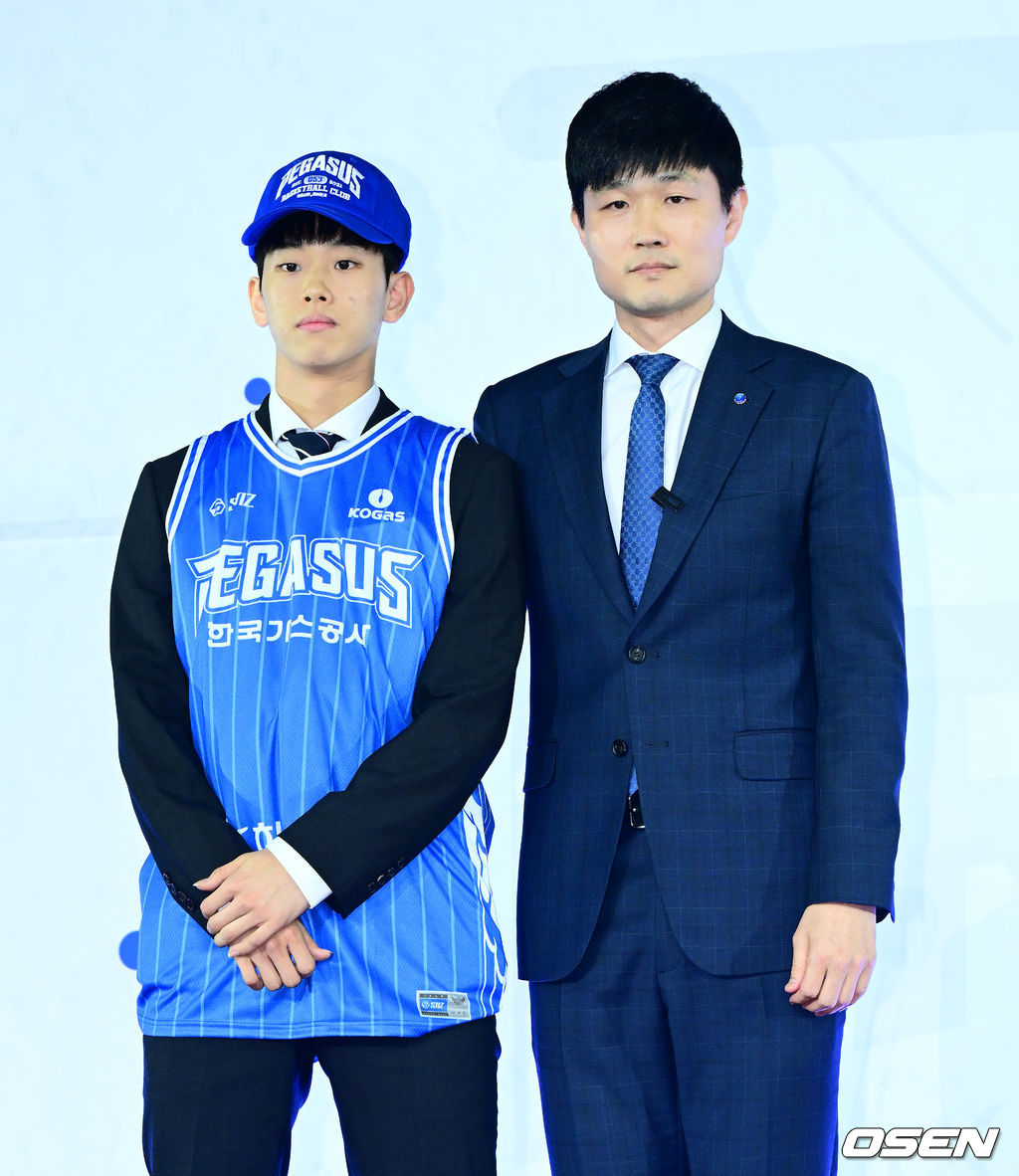 삼일고 양우혁이 1라운드 6순위로 한국가스공사에 지명되며 강혁 감독과 기념 촬영을 하고 있다. 2025.11.14 /jpnews@osen.co.kr