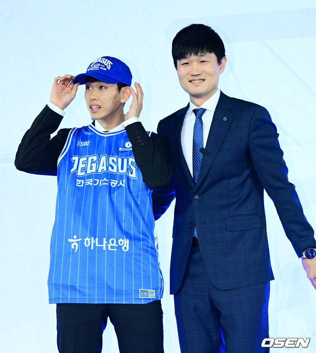 삼일고 양우혁이 1라운드 6순위로 한국가스공사에 지명되며 강혁 감독과 기념 촬영을 하고 있다. 2025.11.14 /jpnews@osen.co.kr