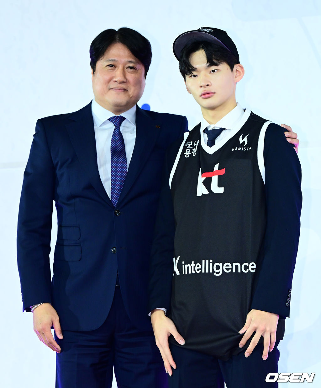 성균관대 강성욱이 1라운드 8순위로 KT에 지명되며 문경은 감독과 기념 촬영을 하고 있다. 2025.11.14 /jpnews@osen.co.kr