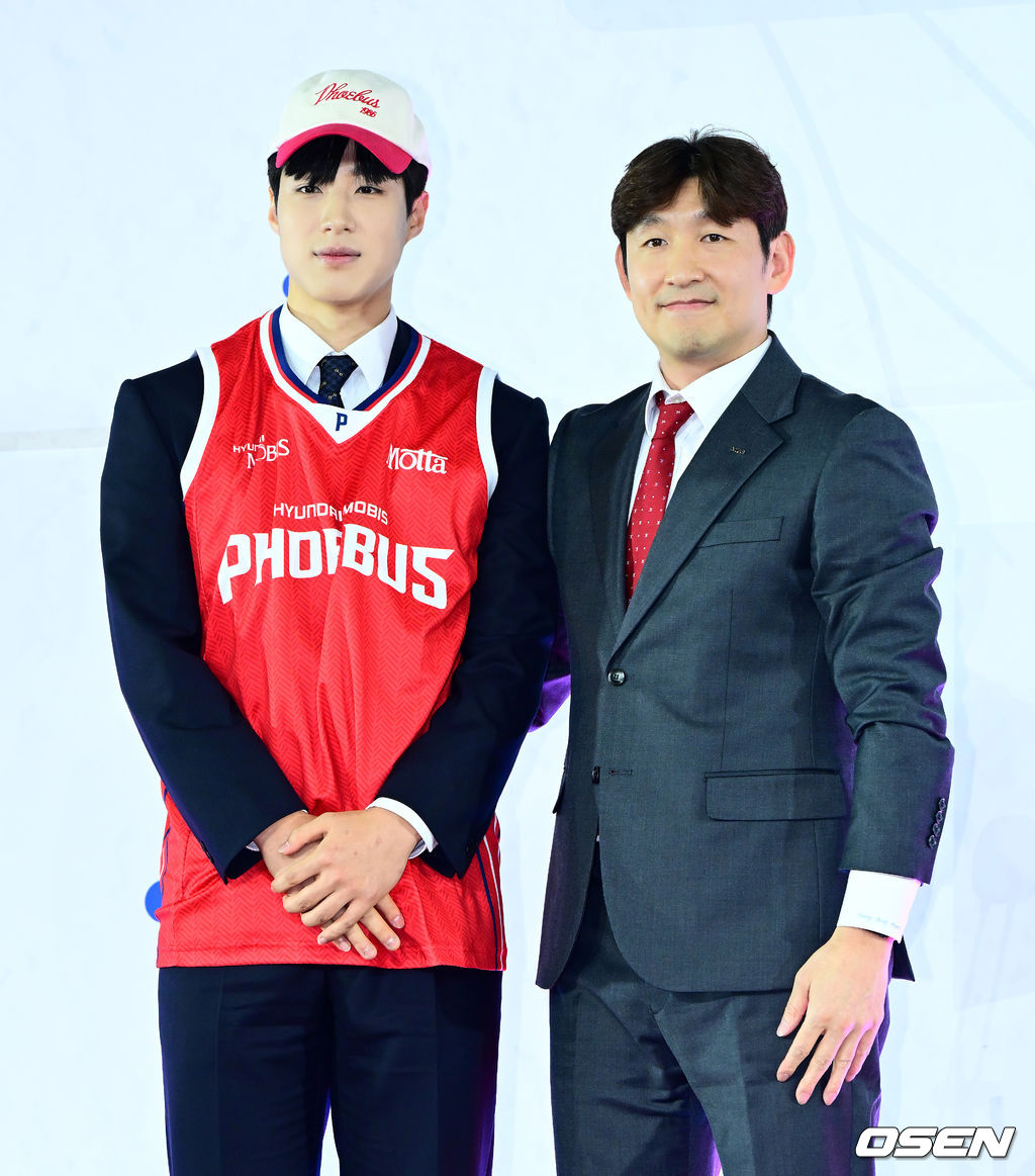 단국대 최강민이 1라운드 7순위로 현대모비스에 지명되며 양동근 감독과 기념 촬영을 하고 있다. 2025.11.14 /jpnews@osen.co.kr