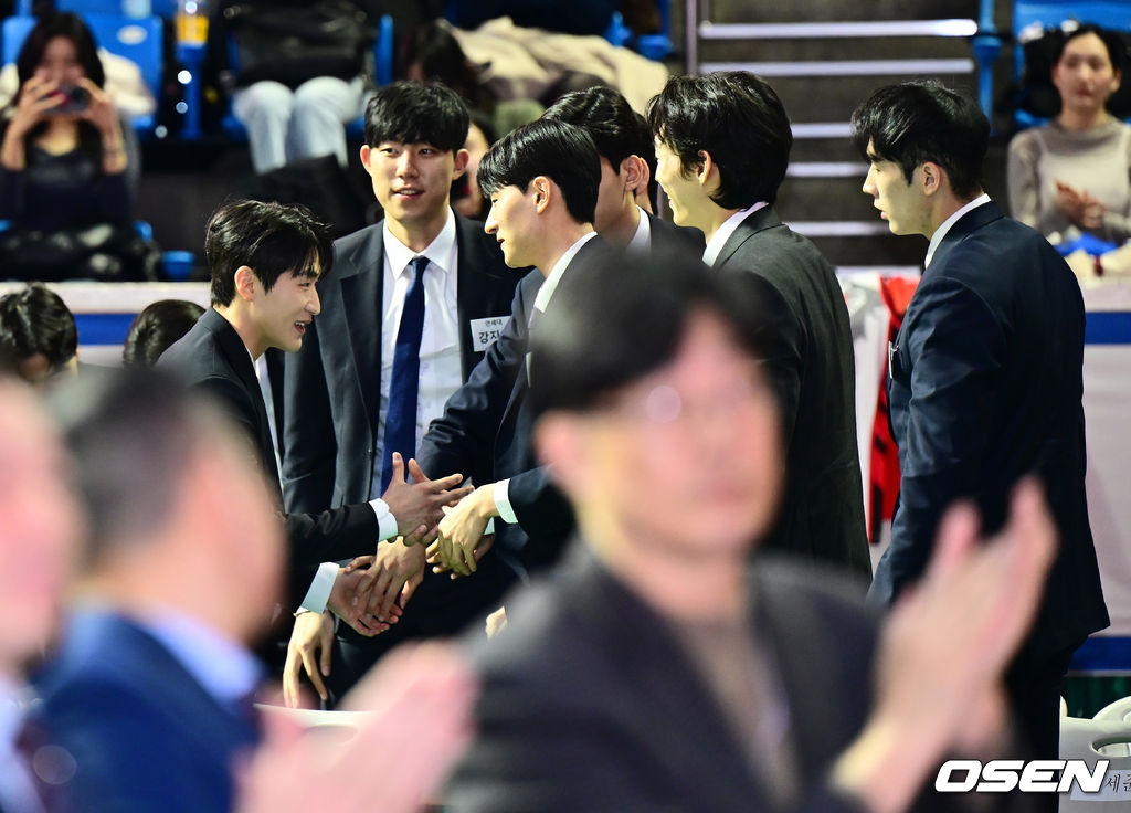 1라운드 1순위로 정관장에 지명된 고려대 문유현이 동료선수들의 축하를 받고 있다. 2025.11.14 /jpnews@osen.co.kr
