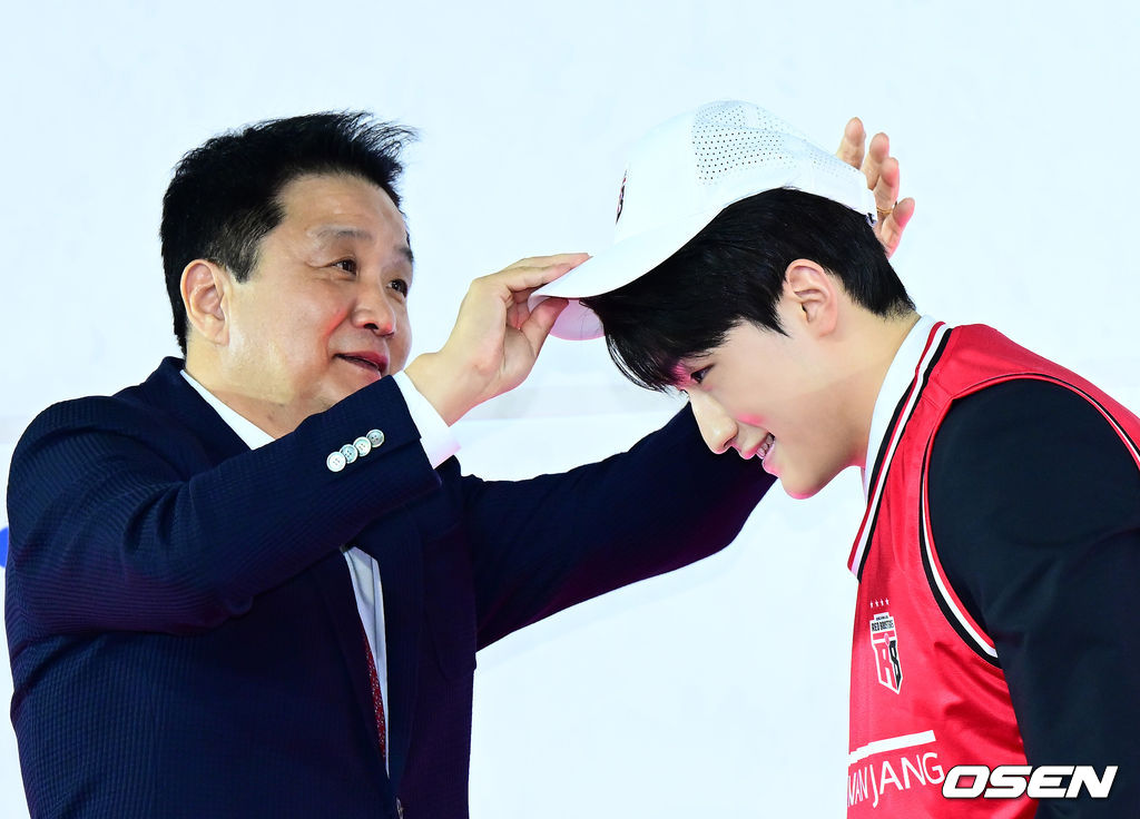 1라운드 1순위로 정관장에 지명된 고려대 문유현이 유도훈 감독에게 모자를 건네받고 있다. 2025.11.14 /jpnews@osen.co.kr