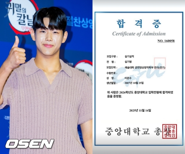 이준수는 실기 전형을 통해 예술대학 공연영상창작학부 연극(연기) 전공에 합격했다. 앞서 지난 8일 이준수가 다니고 있는 연기학원 측은 ‘일상’이라는 짧은 문구와 함께 서울예술대학교 공연학부 연기전공 수시 모집 최종 합격 통지서를 공개했다.