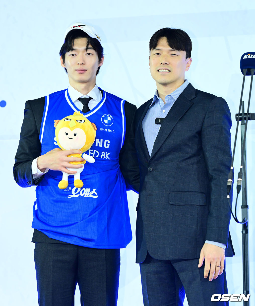 경희대 안세준이 2라운드 6순위로 삼성에 지명되며 김효범 감독과 기념촬영을 하고 있다. 2025.11.14 /jpnews@osen.co.kr
