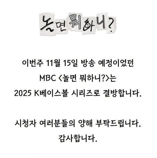 이와 관련 '놀면 뭐하니?' 측은 공식 SNS를 통해 "이번주 11월 15일 방송 예정이었던 MBC '놀면 뭐하니?'는 2025 K베이스볼 시리즈로 결방한다. 시청자 여러분들의 양해 부탁드립니다"라고 직접 밝혔다.