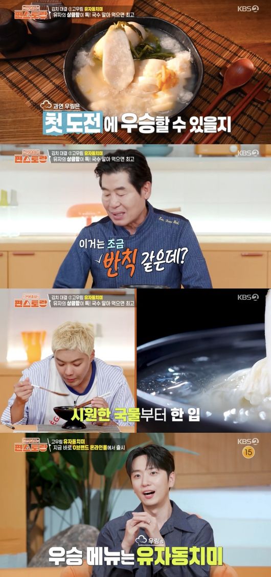 이날 김치 대결로 이정현은 오렌지 깍두기를, 김재중은 특제 양념을 가미해 맛 김치를 선보였다. 반면 ‘편스토랑’ 첫 출연인 고우림은 유자동치미를 공개했다. 그는 “제가 준비한 메뉴는 유자 총각동치미다. 동치미를 총각김치 이용해서 씹히는 맛 극대화해서 유자청을 넣어서 상큼한 맛과 단맛을 조화롭게 사용했다”라고 설명했다.