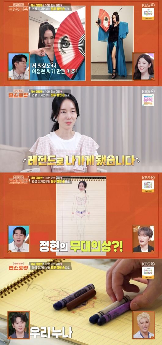 스튜디오에서 붐은 “그때 입었던 의상이 없냐”라고 물었고, 이정현은 “의상이 없다. 스타일리스트들이 다 은퇴를 했는지”라며 원단 구매부터 디자인까지 직접 제작했다고 설명했다. 심지어 안무팀 의상까지 직접 혼자 다 만든다고 덧붙여 놀라움을 안겼다.
