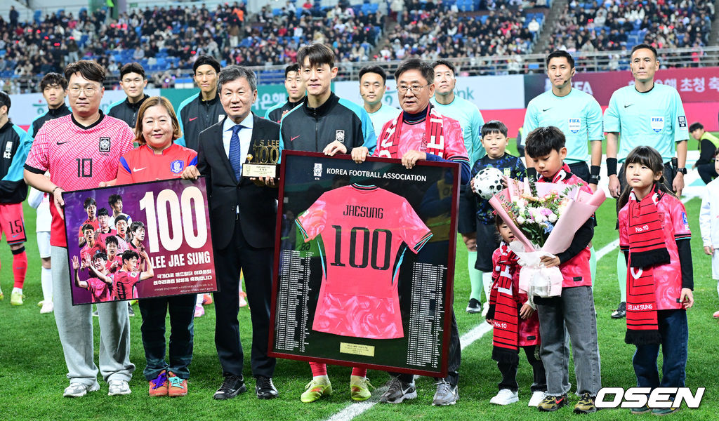 경기를 앞두고 센츄리클럽에 가입한 한국 이재성이 정몽규 대한축구협회장을 비롯한 관계자들에게 기념 트로피를 전달받은 뒤 자녀들과 함께 기념촬영을 하고 있다. 2025.11.14 / dreamer@osen.co.kr