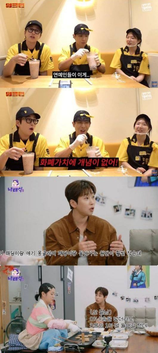 딘딘은 앞서 지난 8월 공개된 ‘워크맨’ 콘텐츠에서 이준과 함께 저가형 프랜차이즈 커피 브랜드의 아르바이트생으로 일했다. 당시 이준은 컵빙수와 커피 등 온갖 음료를 쉬지 않고 만들어 내면서 실제 직원에게 “지금 많이 벌지 않나. 월 1000만 원씩 찍지 않나”라고 물었다.