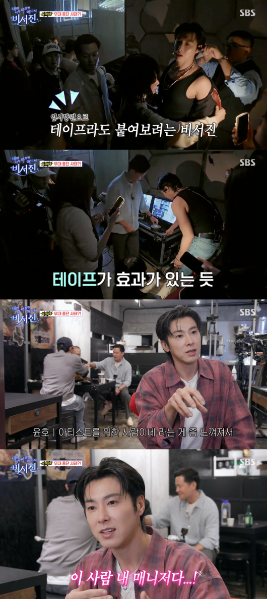 가수 유노윤호가 생방송 중 발생한 돌발 상황에서 배우 이서진의 재치 덕분에 무대를 무사히 이어갔다.