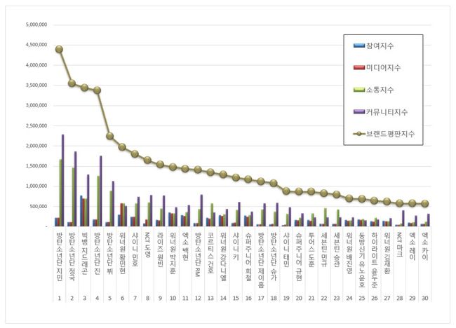 5위, 방탄소년단 뷔 브랜드는 참여지수 107,119 미디어지수 114,278 소통지수 894,272 커뮤니티지수 1,126,876이 되면서 브랜드평판지수 2,242,545로 분석됐다. 지난 10월 브랜드평판지수 3,161,641과 비교해보면 29.07% 하락했다.