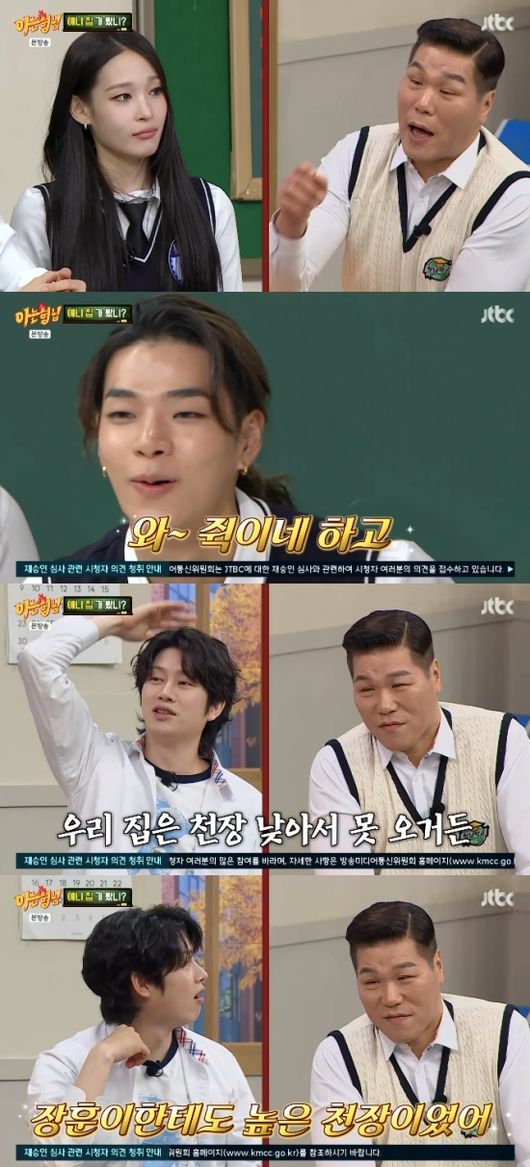 타잔은 “나는 라면 한 그릇 먹고. ‘와 쥑이네’ 하고 잠깐 (집) 구경했다. 장훈이한테도 (높은) 천장이다”라며 리얼한 반응을 드러냈다.