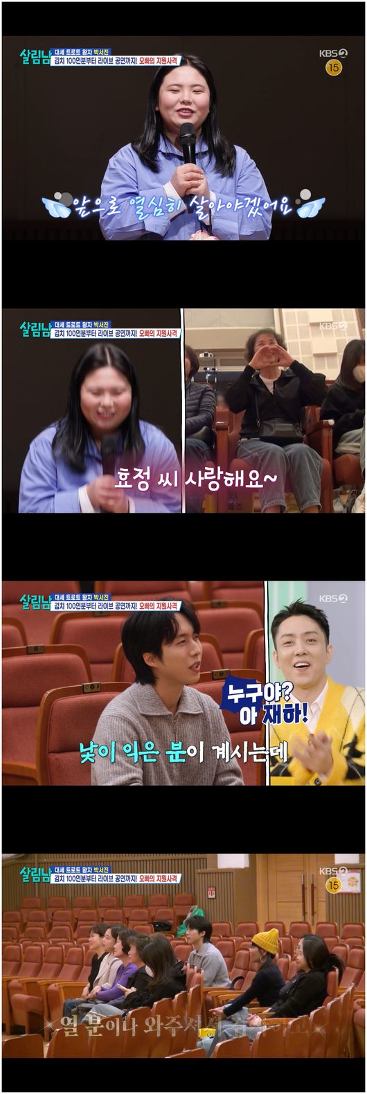 그러나 박효정에게 실제로 댓글을 달던 팬들이 등장했다. KBS 아트홀로 찾아온 이들은 박효정의 매력을 말해주며 박효정을 응원했고, 박효정은 손수 담근 김치로 보답했다. 한 팬은 박효정의 김치를 받고 울었다. 박서진은 “저도 기억에 나신 분이다. 저 분께서 2년 전에 어머니를 여의셨다. 그런데 그 이후 누군가가 김치를 담가준 적이 없는데 박효정이 김치를 담가주어 그것에 울컥하셨다고 했다”라고 말했다.