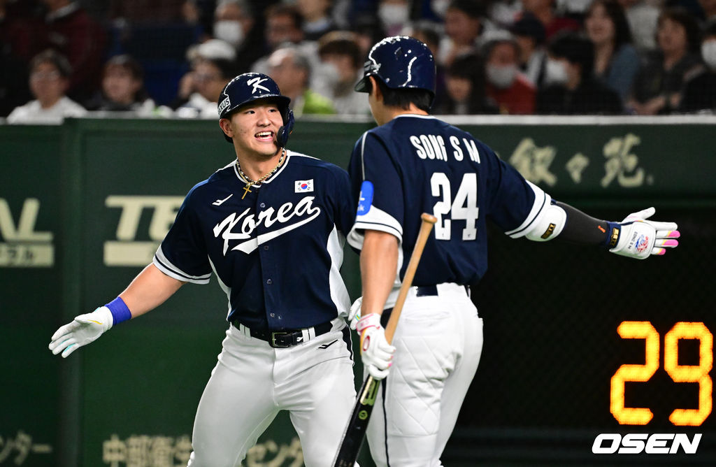 4회초 무사 1루에서 대한민국 안현민이 선제 2타점 좌중월 투런포를 날리며 송성문과 기뻐하고 있다. 2025.11.15. /cej@osen.co.kr