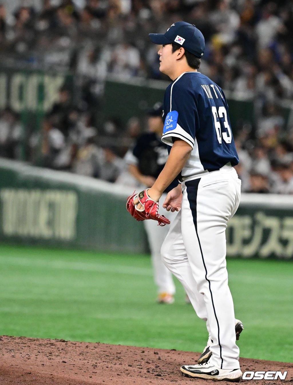 4회말 1사 1,2루에서 대한민국 김택연이 일본 사사키에게 스트레이트 볼넷을 내준 뒤 아쉬워하고 있다. 2025.11.15 /cej@osen.co.kr