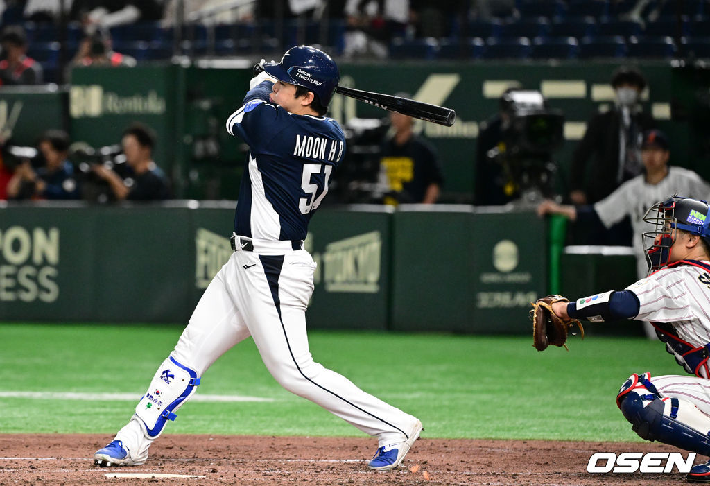 5회초 무사에서 대한민국 문현빈이 내야 안타를 날리고 있다. 이후 4심 합의 결과 투수 맞고 1루수 플라이 아웃으로 처리됐다. 2025.11.15. /cej@osen.co.kr