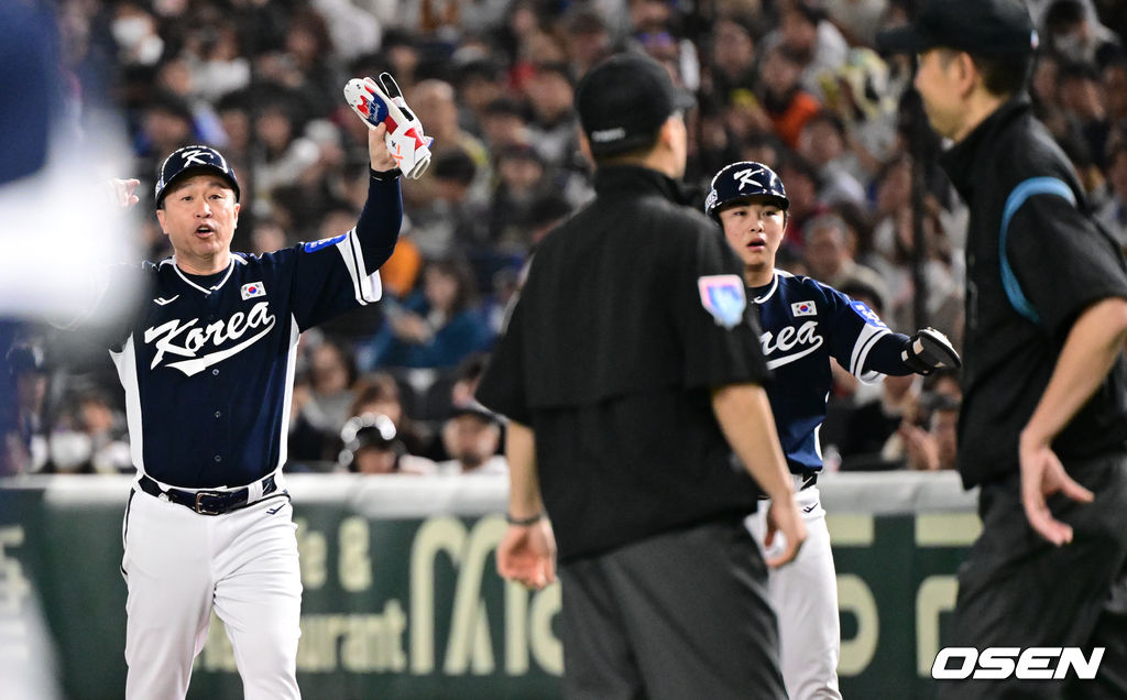 5회초 무사에서 대한민국 문현빈이 내야 안타가 아닌 4심 합의 결과 투수 맞고 1루수 플라이 아웃으로 처리되자 이동욱 코치와 아쉬워하고 있다. 2025.11.15. /cej@osen.co.kr