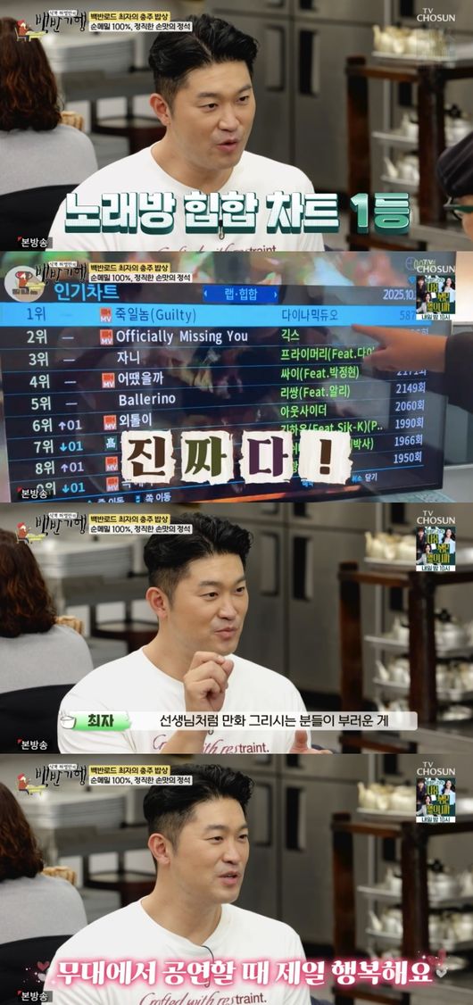 그러자 허영만은 “지금까지 낸 곡 중에 효자곡은 뭐가 있냐”라고 궁금해했다. 최자는 “‘고백’이라는 곡도 있고 ‘죽일 놈’이라는 곡도 있다. ‘죽일 놈’이 저를 살렸다. 지금도 노래방 힙합 차트 거의 1등이다. 발표된 이후로 계속 1등이었다”라고 밝혔다.