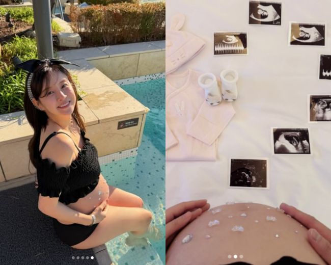 사진에는 은가은이 태어날 2세의 귀여운 옷과 양말, 모자와 함께 초음파 사진을 나열해 놓은 모습이 담겼다. 이어 그는 초음파 사진 앞에 만삭의 배를 공개하며 아름다운 D라인을 자랑했다. 이에 남편 박현호는 “사랑해요 우리가족♥”이라고 애정을 표했다.