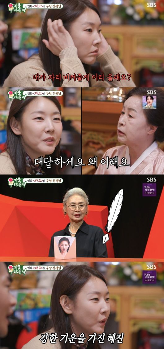 이날 두 사람은 천만 영화 ‘파묘’의 자문 무당 선생님 고춘자를 찾았다. 신당에 처음 와 본다는 한혜진에 무당은 대뜸 “내가 손 한번 짚어볼게”라며 맥을 짚었다.