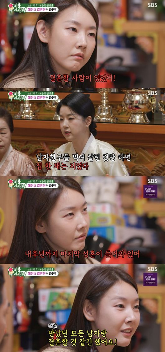 남자친구들을 죄다 먹여 살렸다는 한혜진에 무속인은 “먹여 살린 것만 보면 집 한채는 지었다”고 했고, 어머니는 “저건 맞다”라고 인정했다.