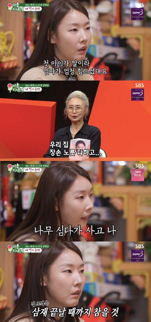 그러자 한혜진은 숨겨왔던 가족사를 밝혔다. 그는 “아버지 나이가 만혼이었다. 칠남매 중 맞이셨는데 동생들보다 장가를 늦게 갔다. 첫 아이가 딸이라 엄마가 엄청 힘드셨다고 하더라”라며 아들을 봐야 한다는 생각에 어머니는 연년생으로 남동생을 낳았다고 설명했다.