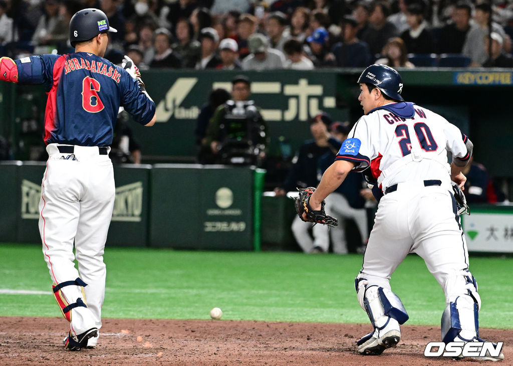 8회초 1사 1,2루에서 대한민국 조형우가 폭투를 허용하고 있다. 2025.11.16 /cej@osen.co.kr