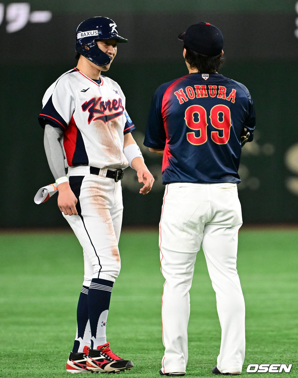 7회말 2사 1,2루에서 대한민국 박해민이 중전안타를 날렸다. 이후 홈으로 쇄도한 2루주자 문현빈이 아웃되자 비디오 판독을 요청했다. 판독을 기다리며 일본 노무라와 이야기 나누는 박해민. 2025.11.16 /cej@osen.co.kr