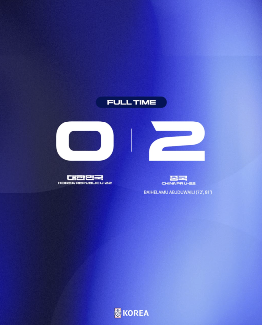 이민성 감독이 이끄는 한국 U-22 대표팀은 15일 중국 정두 솽류스포츠센터에서 열린 2025 판다컵 2차전에서 중국에 0-2로 졌다.