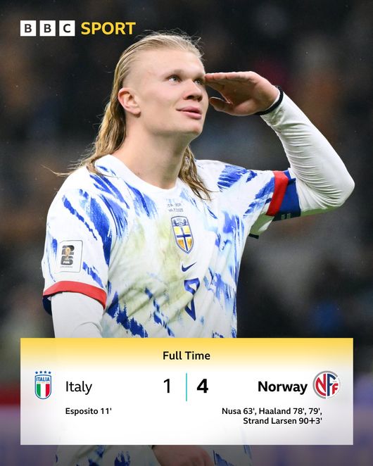 노르웨이는 17일(한국시간) 이탈리아 밀라노의 스타디움 주세페 메아차에서 열린 2026 국제축구연맹(FIFA) 북중미 월드컵 유럽 예선 I조 8차전 원정 경기에서 이탈리아를 4-1로 제압했다.