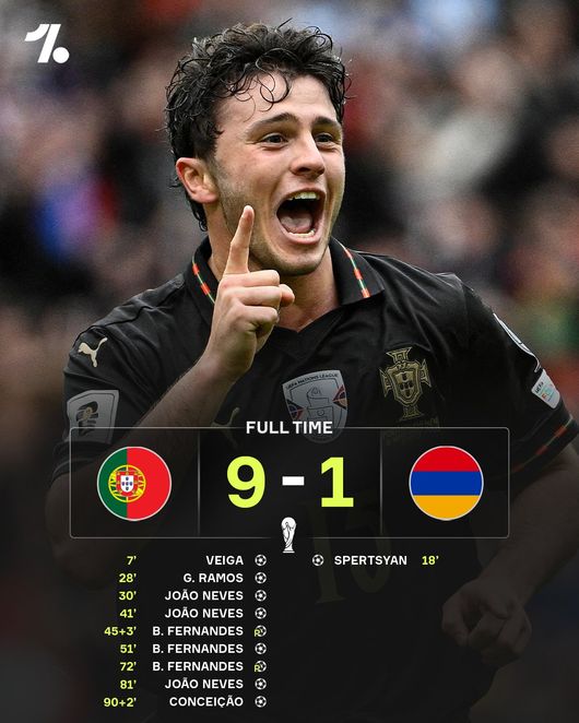 포르투갈은 17일(이하 한국시간) 포르투갈 포르투의 이스타디우 두 드라강에서 열린 2026 국제축구연맹(FIFA) 북중미 월드컵 유럽 지역 예선 F조 최종 6차전에서 아르메니아를 9-1로 대파했다.