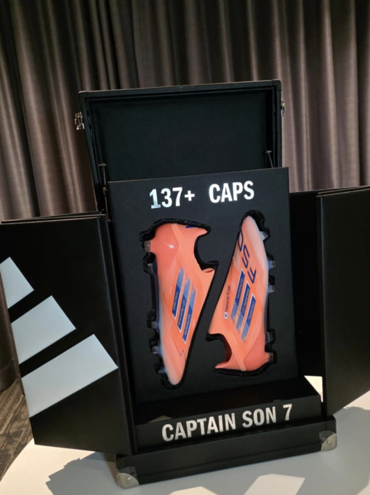 사진을 보면 아디다스는 손흥민의 137번째 A매치 출전을 축하하는 ‘137+CAPS’라는 문구를 새겨넣었다. 밑에는 ‘캡틴손7’이라는 자부심을 적었다. 축구화에는 손흥민의 이름과 함께 태국기와 ‘국가의 자부심’이라는 특별한 문구가 새겨졌다. 손흥민이 자부심을 느낄 수 있는 문장이다.