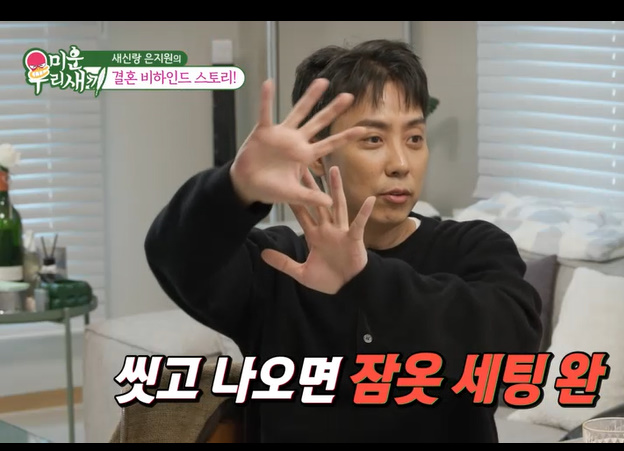 은지원 역시 “평소에도 입을 옷을 다 골라준다. 양말, 마스크도 어디 있는지 모른다”며 “샤워하고 방에서 나오면 잠옷이 세팅돼 있다. 너무 자랑인가?”라며 머쓱하게 웃었다. 이어 “원래 아내가 챙기는 성향이다. 자기 루틴이 확실하다. 모델하우스나 호텔에서 사는 느낌으로 지낸다. 너무 깔끔하다”며 자랑을 이어갔다.