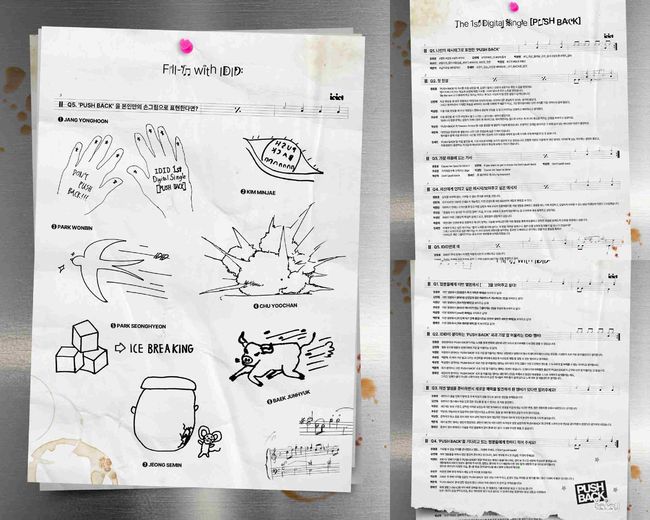 ‘아이스 브레이킹’의 제목인 ‘Fill in with IDID‘의 ’Fill in’은 ’채우다‘라는 의미와 함께 드럼 용어이자 단조로운 리듬 사이에 변화를 주어 곡을 더 생생하게 만드는 연주자의 개성을 드러내는 장치라는 중의적 표현으로, 아이딧(IDID)이 이번 앨범을 통해 표현하고자 하는 음악적인 영감을 가득 채워 넣었다. 이 밖에 나만의 해시태그와 손 그림으로 표현한 ‘PUSH BACK’은 아이딧(IDID) 멤버들의 개성과 취향을 그대로 드러내 미소를 유발한다. 물고기를 찾는 전단지 느낌의 트랙리스트와 결이 닮은 종이에 연필과 펜으로 거침없이 채운 그림과 악보 또한 ‘하이엔드 청량돌’에서 ‘하이엔드 러프돌’로 진화 중인 그룹의 색다른 변신을 기대케 한다.