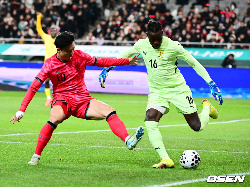 전반 대한민국 오현규가 가나 아사레를 압박하고있다. 2025.11.18 /jpnews@osen.co.kr