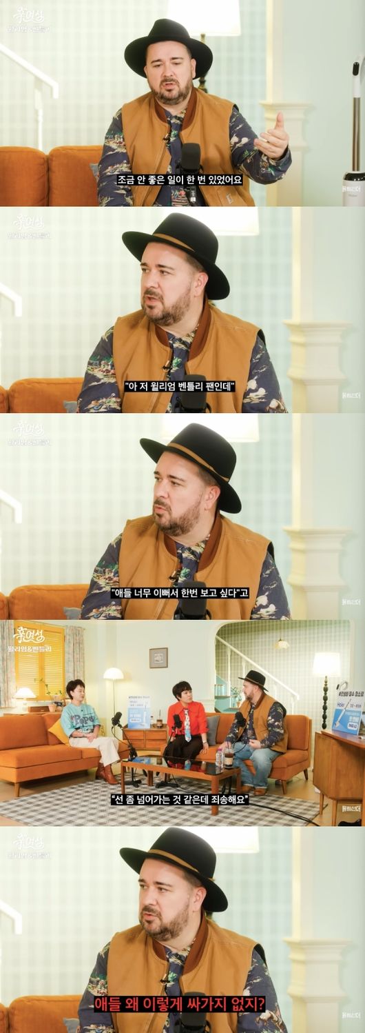 샘 해밍턴은 “(방송) 자료가 평생 남는 게 가장 (걱정이) 컸다. 하다 보니까 조금 안 좋은 일이 한 번 있었다. 어느 날 아침 8시 반인가 갑자기 띵똥 (했다). ‘저 윌리엄, 벤틀리 팬인데 애들이 너무 예뻐서 한 번 보고 싶다’고 (하더라). 좀 당황했다. 아내가 ‘이건 조금 선을 넘어가는 것 같다. 죄송하다’ 했다”라며 모르는 사람이 집으로 갑자기 찾아왔던 황당 사건을 토로했다.